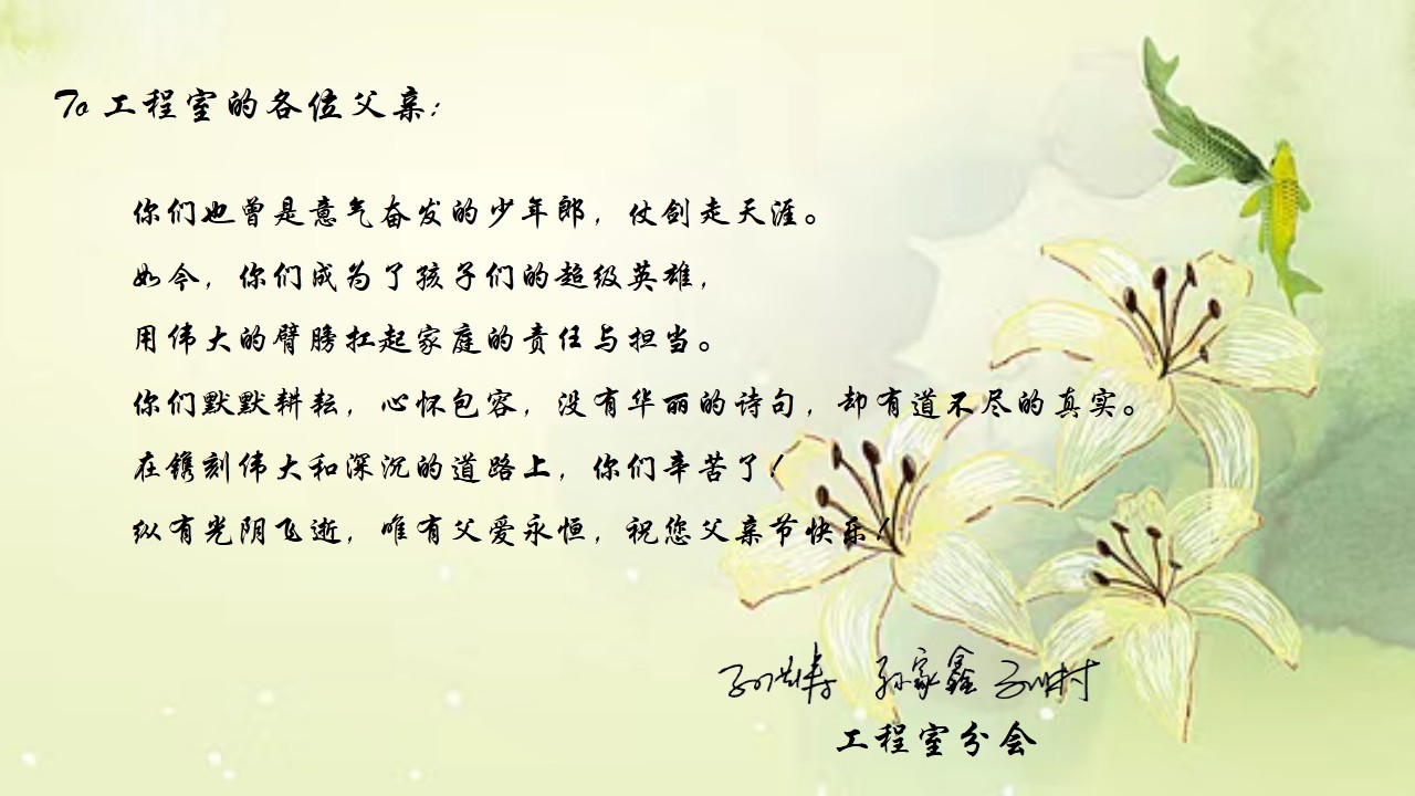 父親的字典總是寫滿堅強,流著情長,沒有華麗的詩句,卻有道不盡的真實。在第112個父親節來臨之際,東華科技工程室分會舉辦“默默‘父’出致敬父愛”父親節活動,為分會內辛勤耕耘的父親們準備了節日的賀卡,送去了溫馨的祝福。縱有光陰飛逝,唯有父愛永恒,向每一位偉大而深沉的工程父親致敬!